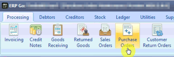 Navigate to Processing --> Purchase Orders or Stock --> Processing --> Purchase Orders