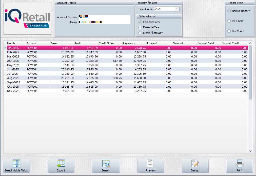 In the next section you will see the debtors monthly sales, credit notes and payments: