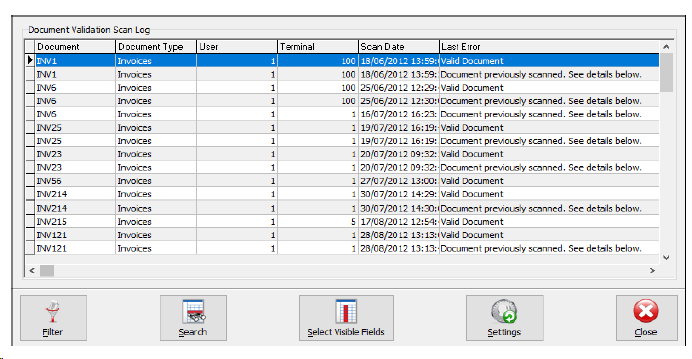 The Document Validation module allows a user to scan the relevant document (for example, an invoice or cash sale). The scanned document can then be compared with the printed document, enabling verification of stock items and quantities.