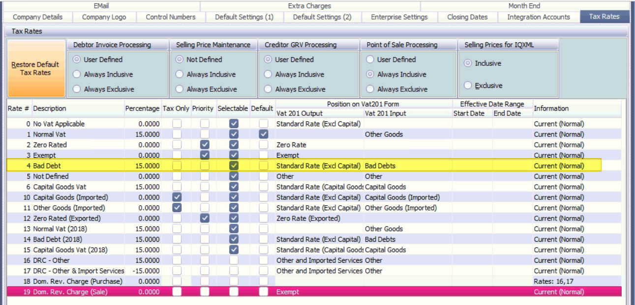 Also ensure that the Position on the VAT201 is set to Bad Debt; otherwise, it will not appear on the VAT201 form.