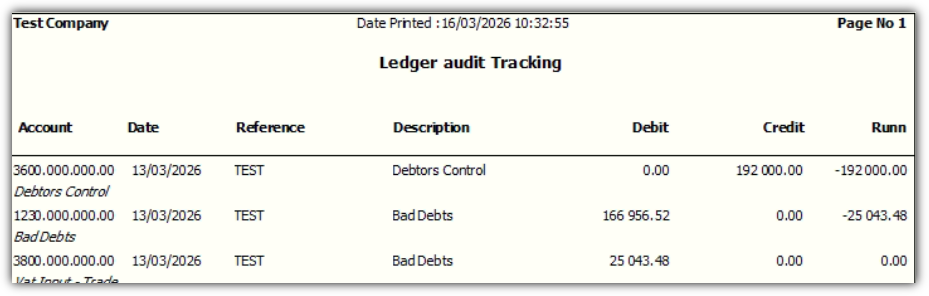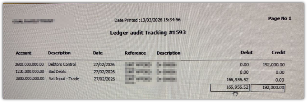 When reviewing the journal, the Bad Debts and VAT Input – Trade entries are incorrect. (Please refer to Screenshot 1.)