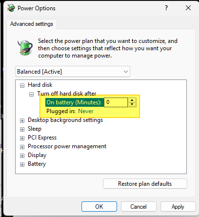 Set “Turn off hard disk after” to 0 minutes for both On Battery and Plugged in.