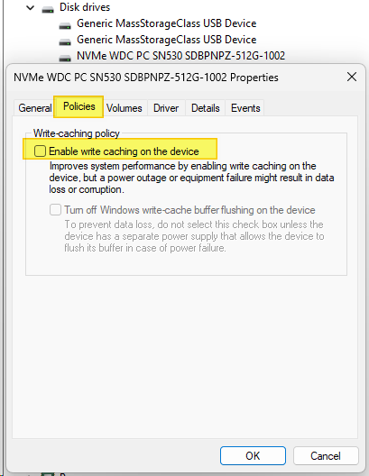 Deselect the option “Enable write caching on the device.”