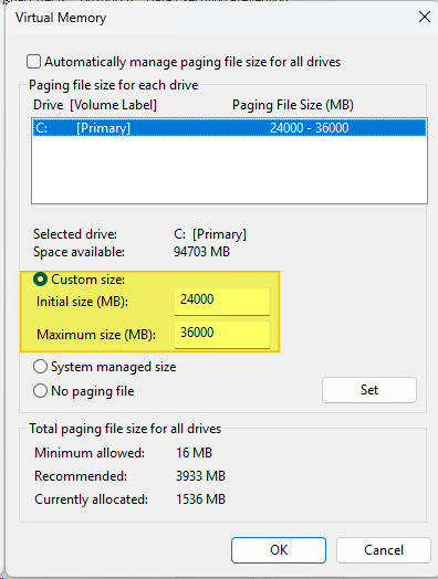 For example, if your machine has 24 GB of RAM, you can configure the page file as follows: