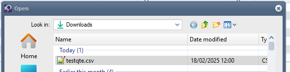 This will then open the file explorer to find your csv file to import: