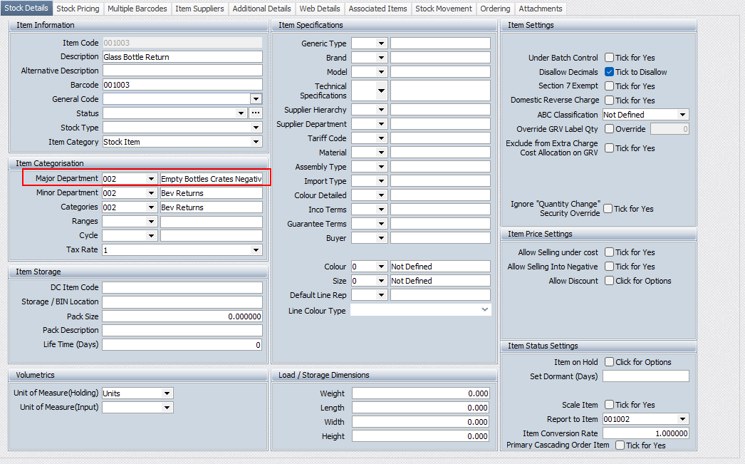 With the Glass Bottle Return item it is important to ensure that the major department is selected correctly as the negative department: