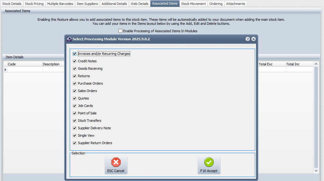 Go to the Associated Items tab at the top and enable the tick box labelled Enable Processing of Associated Items in Modules and pick the desired modules we recommend using GRV , Invoicing and POS as a minimum.