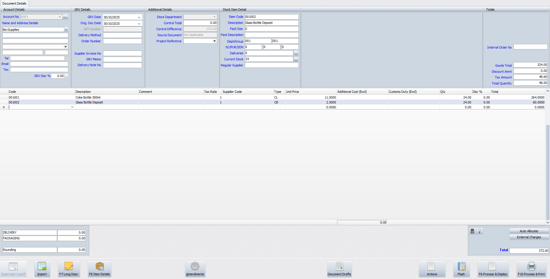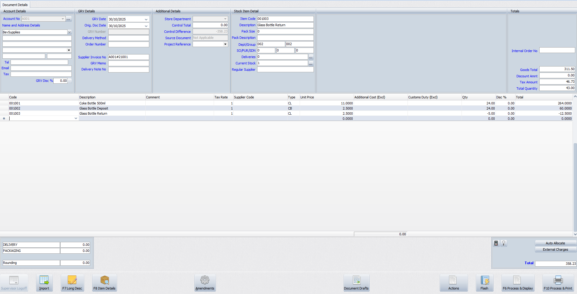 If empty bottles are returned to the supplier, the Glass Bottle Return item can be added to the GRV document as per below: