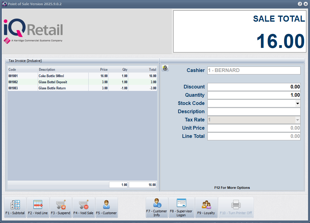 This will mean that every time a Coke Bottle 500ml is rung up a Glass Bottle Deposit will automatically be added to the sale.