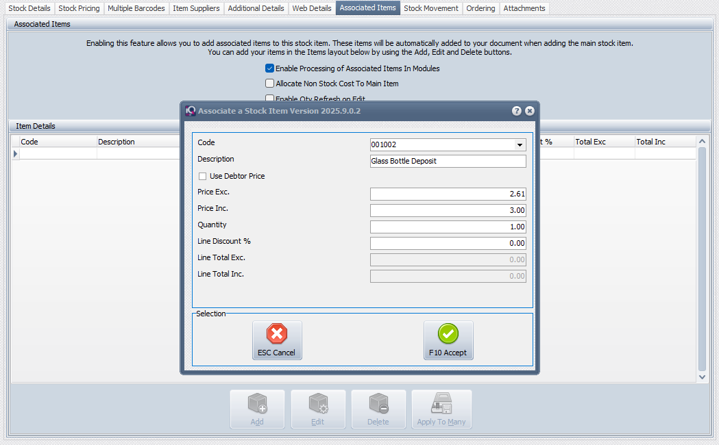 For the cashiers to quickly sell a Coke Bottle 500ml and add the Glass Bottle Deposit we recommend adding the Glass Bottle Deposit item as an associated item in the stock maintenance of the Coke Bottle 500ml.