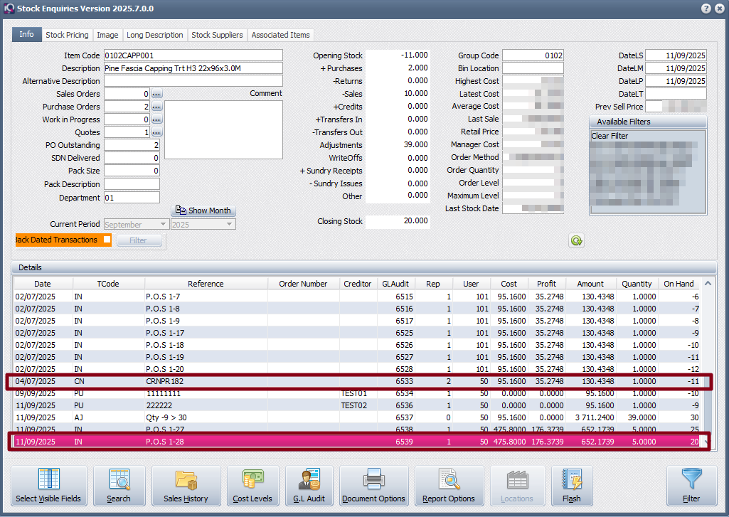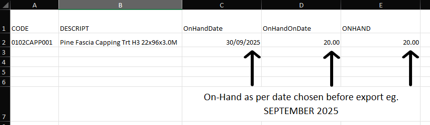 - If you open the excel export with the date chosen for Sept 2025, it will show the ONHAND (20) which is the current and the OnHandOnDate (20) as per OnHandDate (30/09/2025) month chosen: