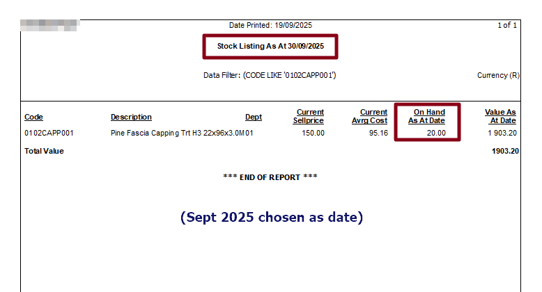 - When date chosen was for Sept 2025 the preview will show the on-hand (20) as at the end of that month as per below: