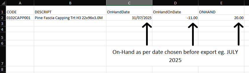 - If you open the excel export with the date chosen for July 2025, it will show the ONHAND (20) which is the current and the OnHandOnDate (-11) as per OnHandDate (31/07/2025) month chosen: