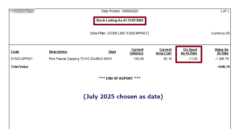 - When date chosen was for July 2025 the preview will show the on-hand (-11) as at the end of that month as per below: