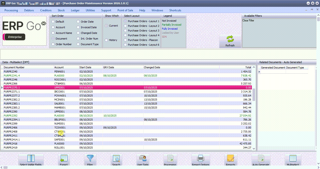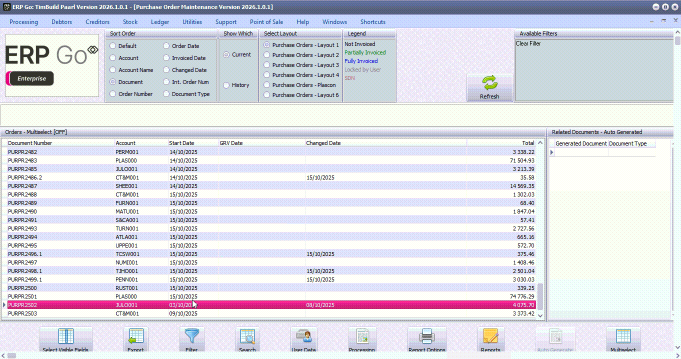 Click on the Processing --> GRV and the system will consolidate purchase order in one GRV.