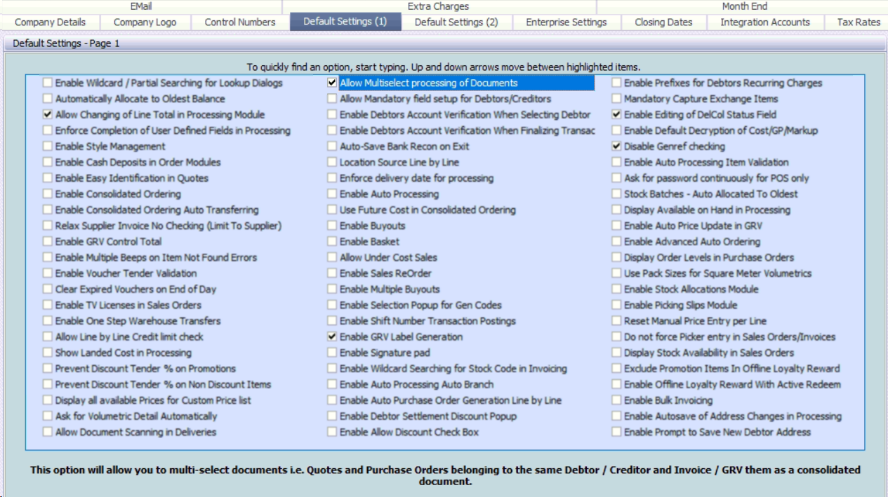 Utilities | Company Details | Default Settings (1) | Allow Multiselect processing of Documents