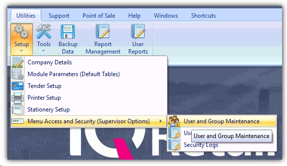 Navigate to: Utilities → Setup → Menu (Security Options) → User and Group Maintenance.